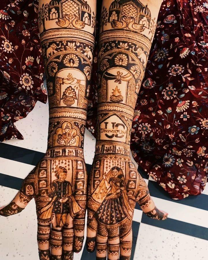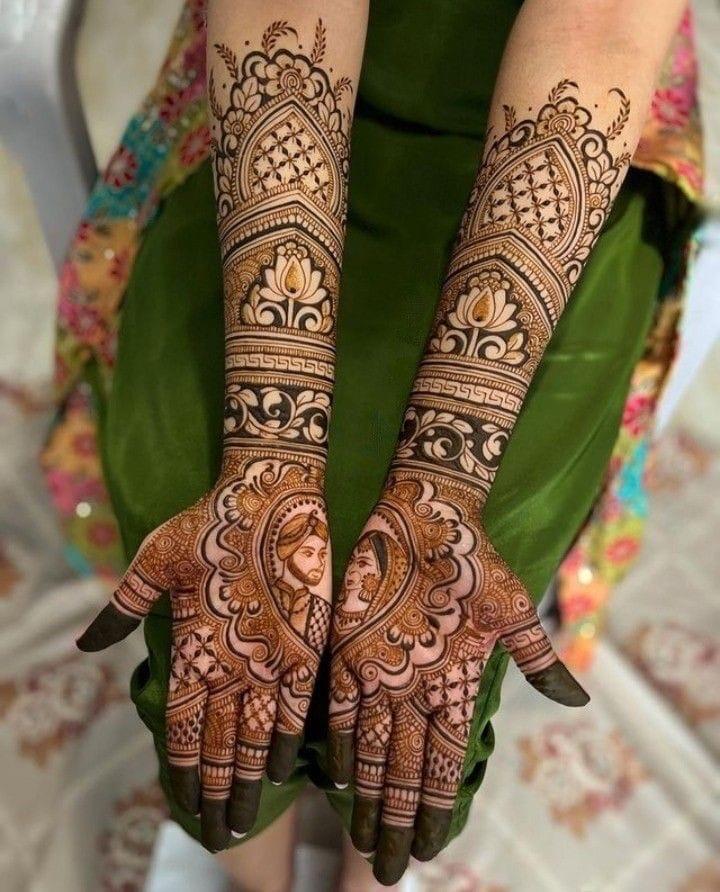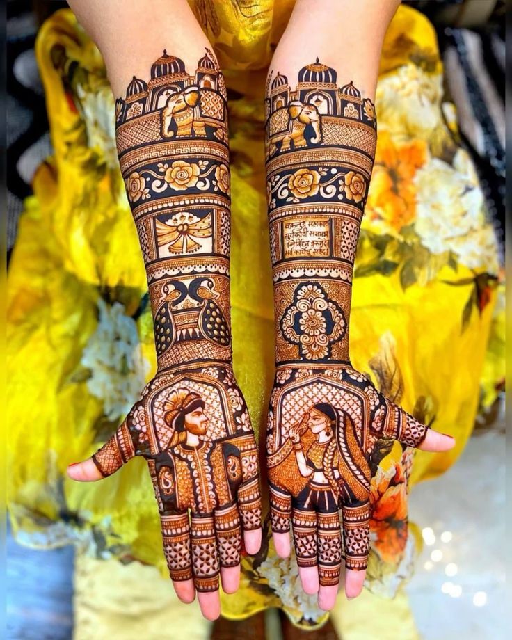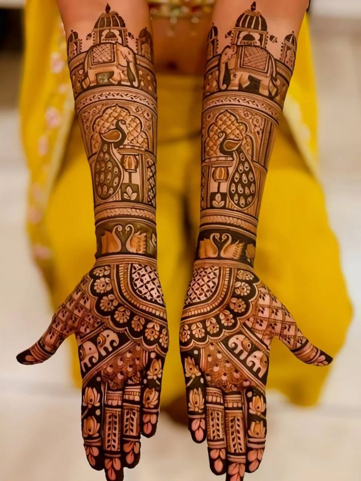 Royal, detailed, and customized bridal mehndi designs crafted for your wedding day. We specialize in dulha-dulhan portraits, full hand and arm coverage, hidden groom names, and traditional motifs that give a luxurious finish.